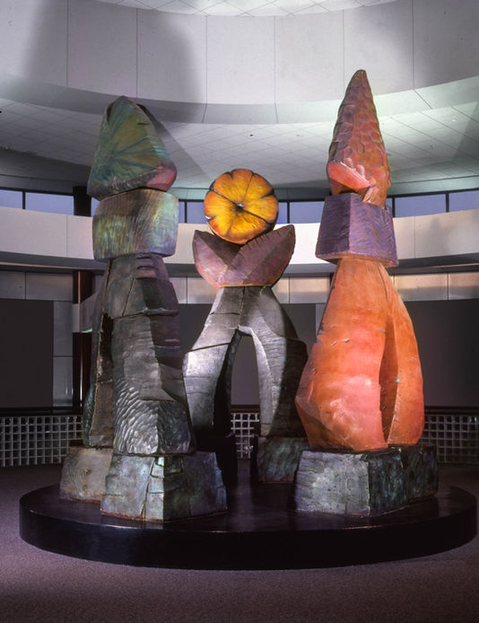 When Nancy Jurs was commissioned to create a public sculpture for the Greater Rochester International Airport, she had to build an enormous addition onto her studio to accommodate the work. This monumental clay work is composed of stacked, pounded, modeled, and chiseled stoneware. Each section weighs between 200-600 pounds. The piece was hand glazed and patina’ed. To fire Triad, it had to be taken to an industrial kiln. The three totem-like structures incorporate symbols of the city: the sailboat, the arrowhead, and the millstone.